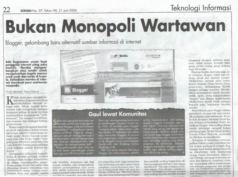 - June 21, 2004 KONTAN, "Bukan Monopoli Wartawan" (scanned .jpg file 106KB, 82KB)