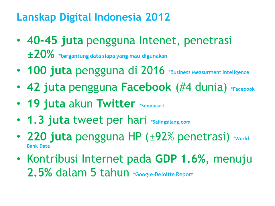 Khususnya di Indonesia, Indonesia adalah negara ke 4 pengguna Facebook di dunia dengan 42 juta akun, negara ke 5 dgn akun Twitter terbanyak, dengan 19 juta akun dan teraktif ke 3 di dunia setelah Amerika Serikat dan Brazil. Indonesia memproduksi 1.5 juta twit per hari dan tidak berhenti ngetwit sepanjang minggu, dari senin hingga senin lagi.